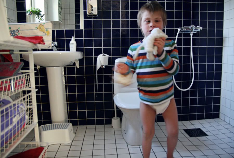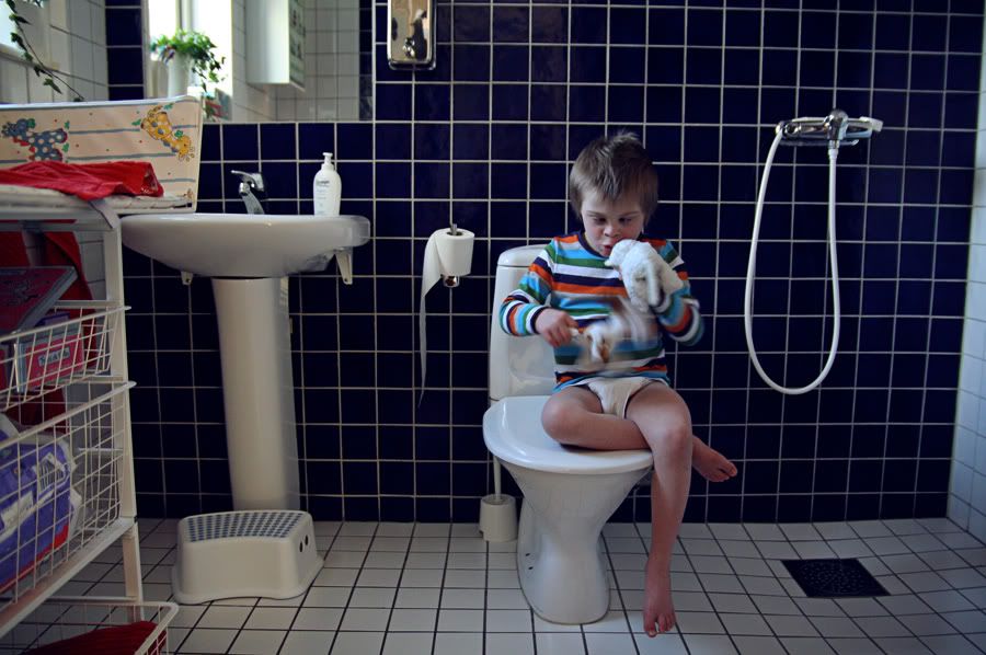 Jag bad Albin att vänta inne på toaletten medan jag sprang och hämtade ett par reda kalsonger.. när jag kom tillbaks så var han faktiskt kvar, han hade slagits sig ner så fint på toaletten. Han är så fin!